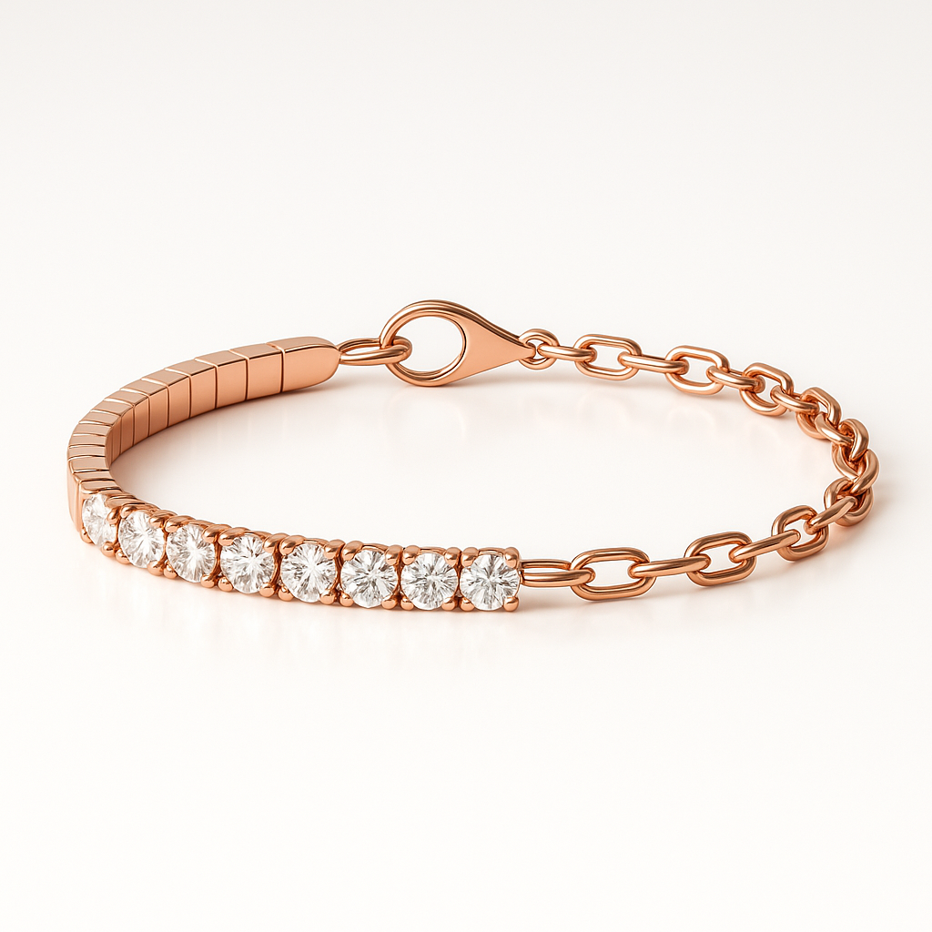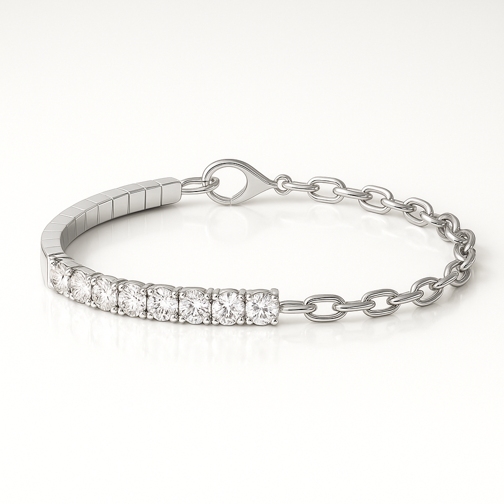 צמיד טניס עדין ומדויק בעיצוב חצי שיבוץ – חצי מהצמיד משובץ באבני מואסנייט D VVS1 בגודל 0.10 קראט (עשיריות) לכל אבן.