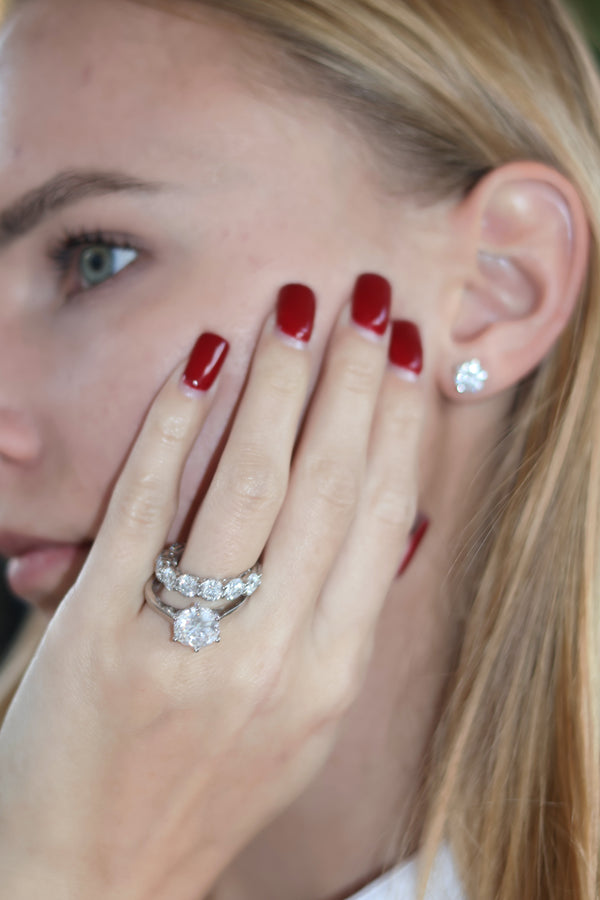טבעת אירוסין סוליטר עגולה במשקל 4 קארט — עיצוב קלאסי, עדין ודק, עם אבן מויסנייט באיכות D VVS1 שיוצרת מראה של יהלום מרחף מעל האצבע. סוליטר טהור, נצחי, שנבנה מסביב לאבן ולא להפך.